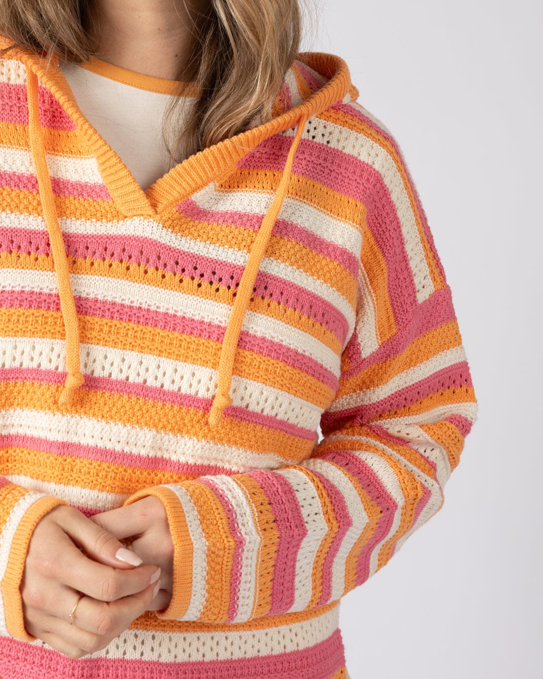 Make a statement with the Aurelia Hooded Jumper. This chunky knit piece combines cosy comfort with contemporary style, featuring a relaxed boxy fit and decorative stitch detailing that adds texture and visual interest. The dropped shoulder design and hood create an effortlessly cool silhouette, perfect for layering on cooler coastal days or wearing as a standout piece on its own.