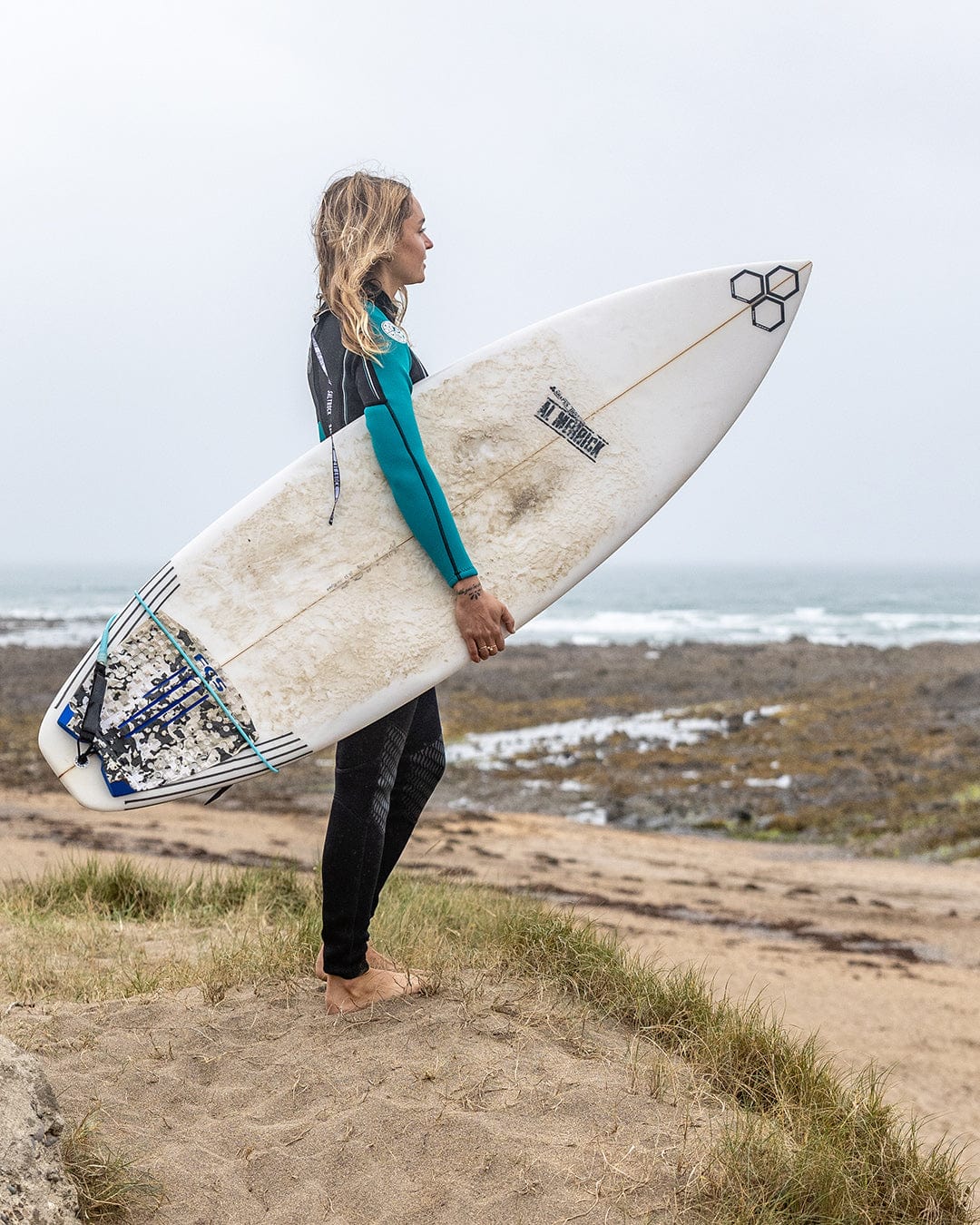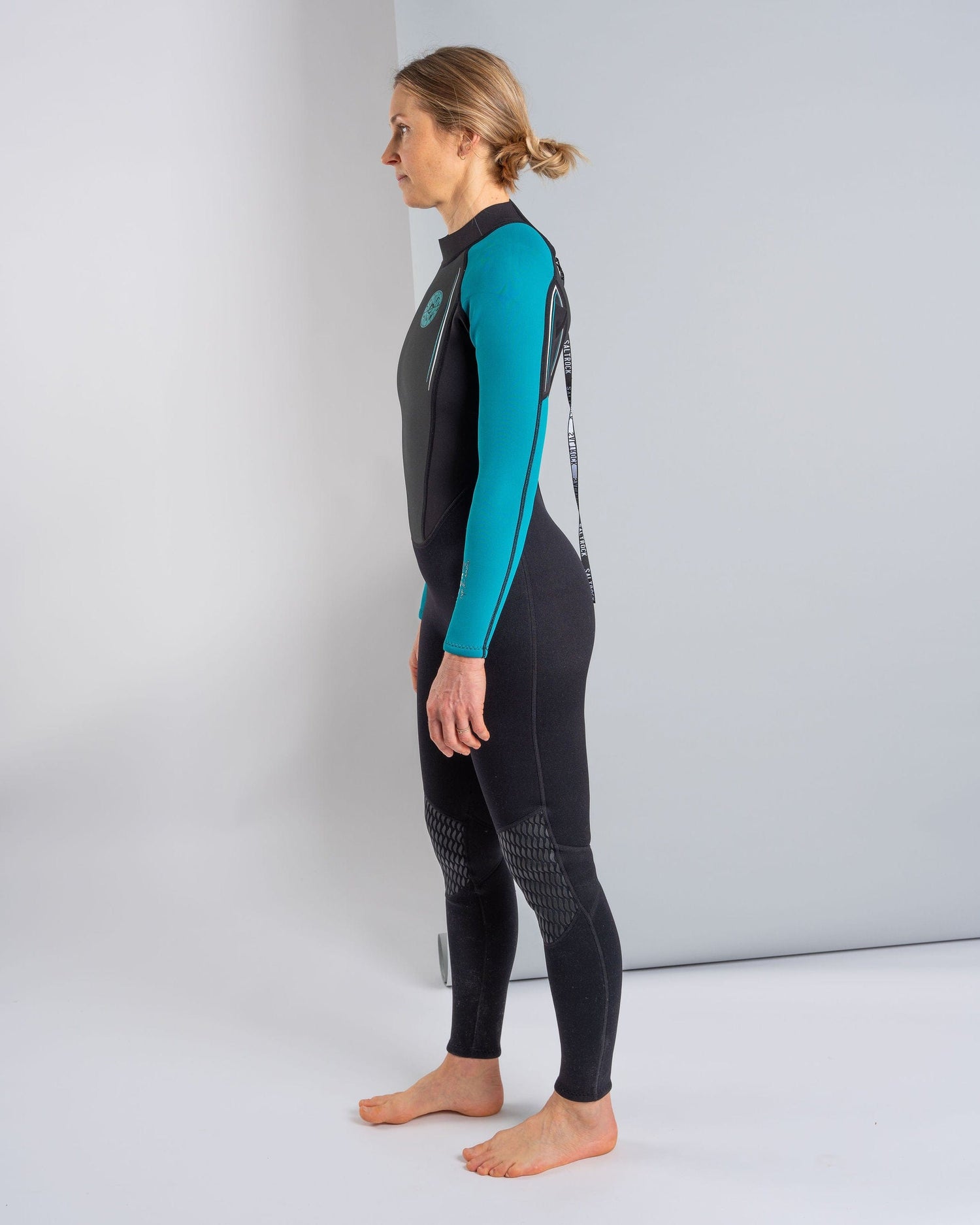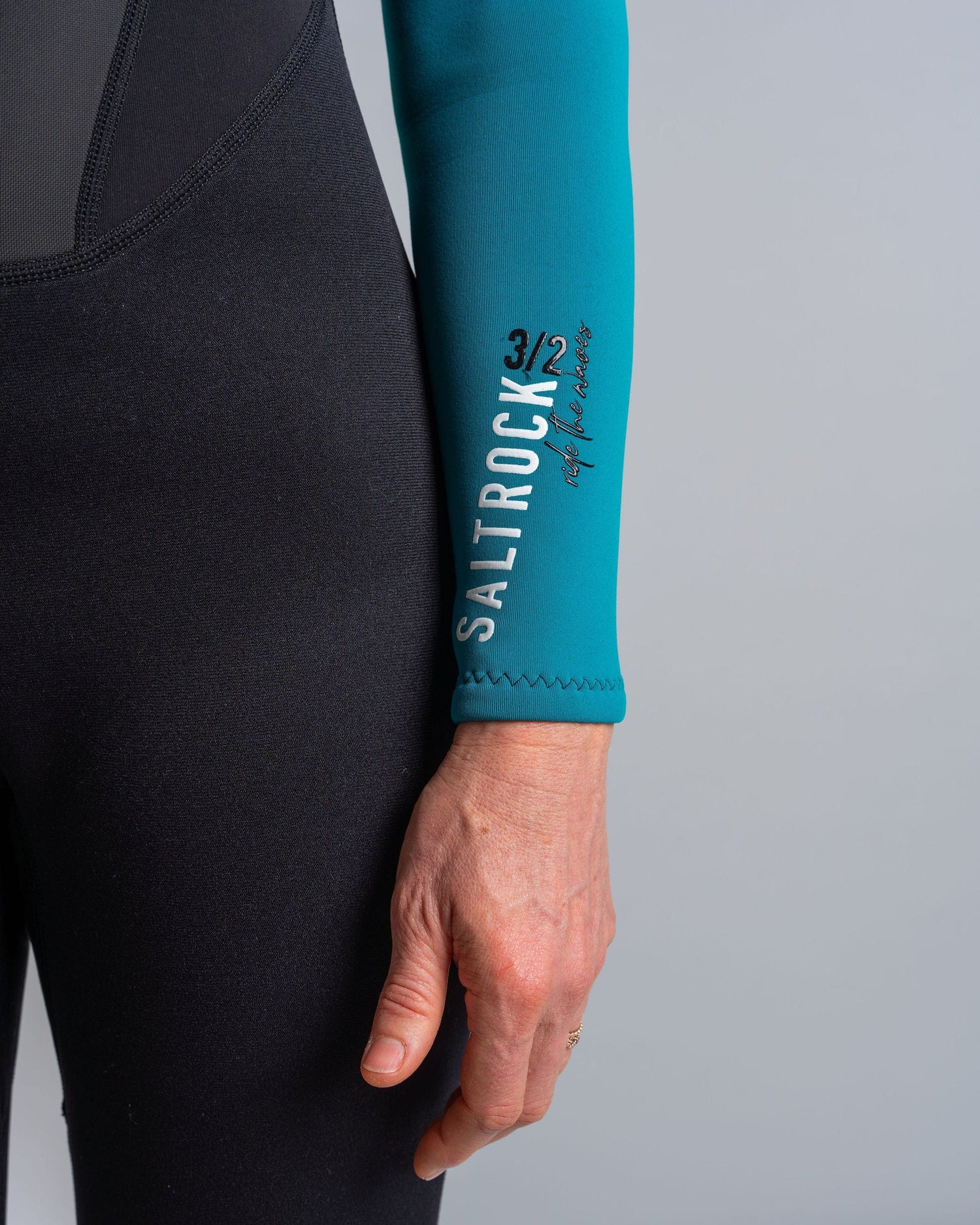 - Black & turquoise wetsuit with Saltrock logo